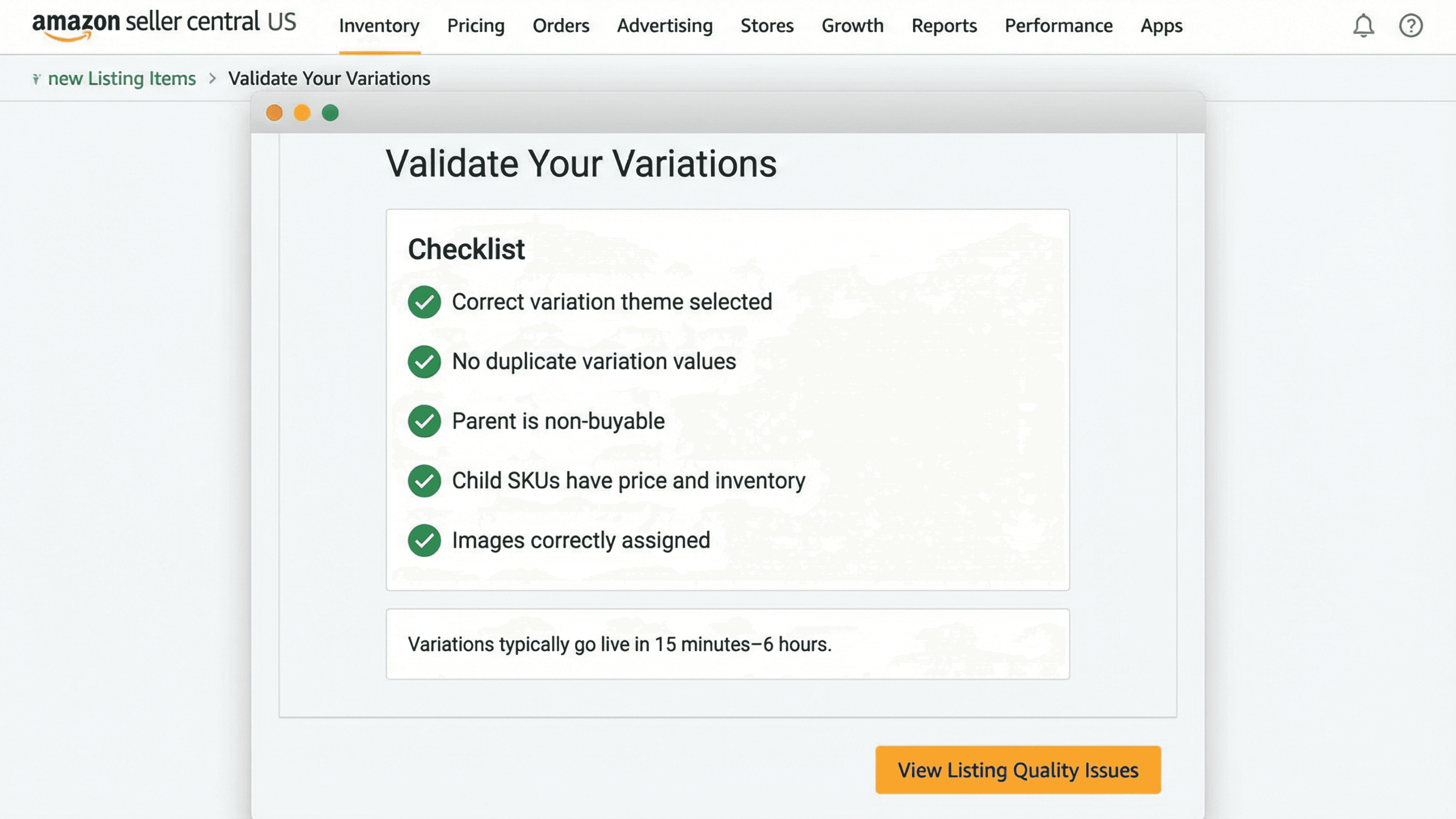 Variations typically go live in 15 minutes–6 hours depending on category.