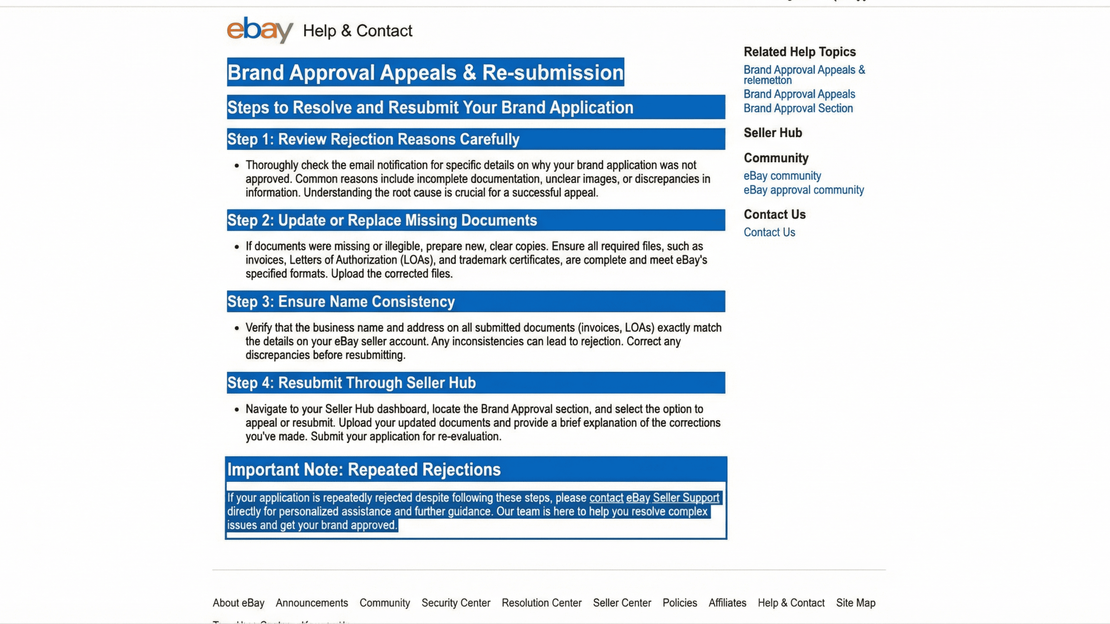 Multiple rejections may require contacting eBay Seller Support directly.