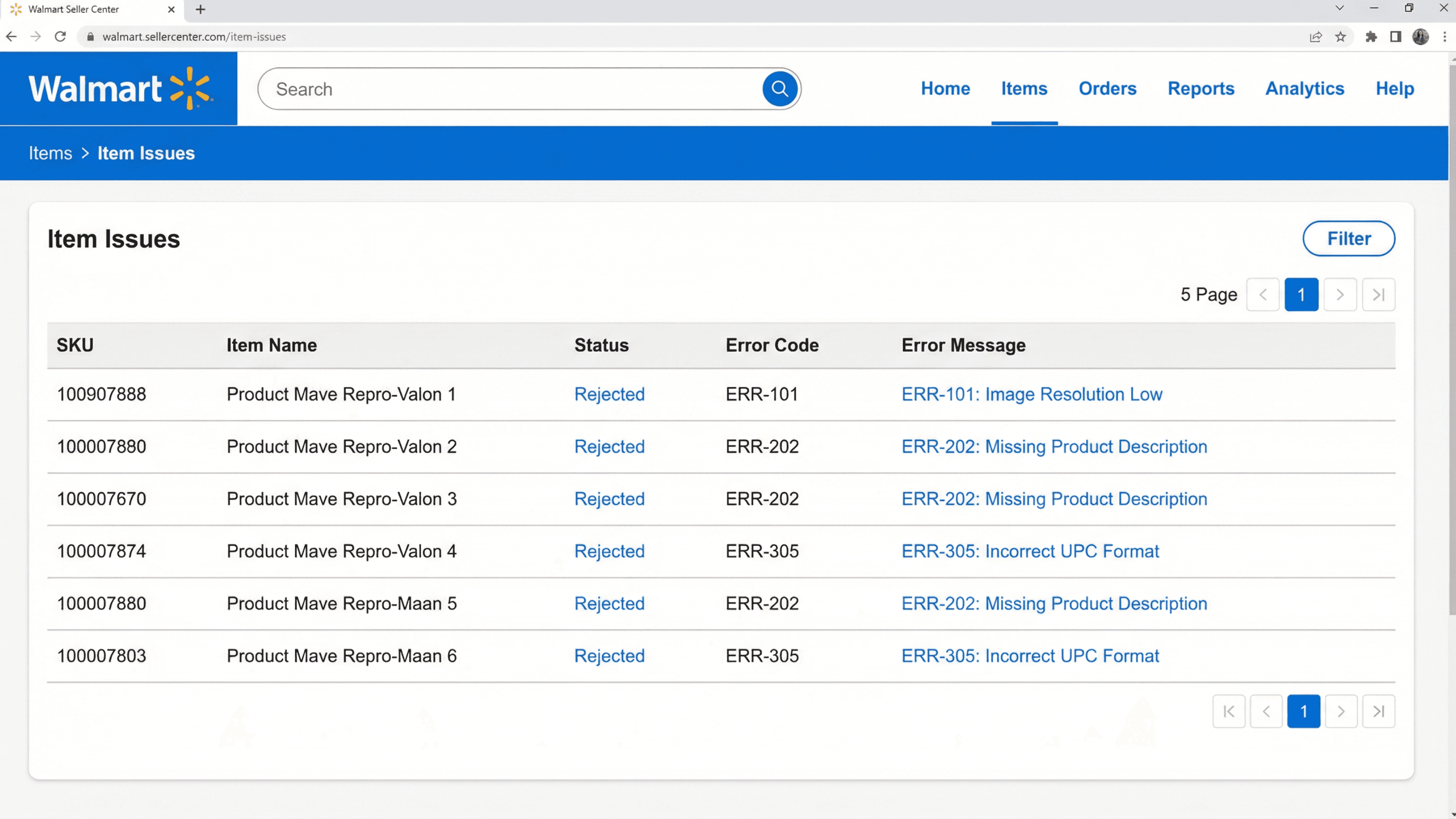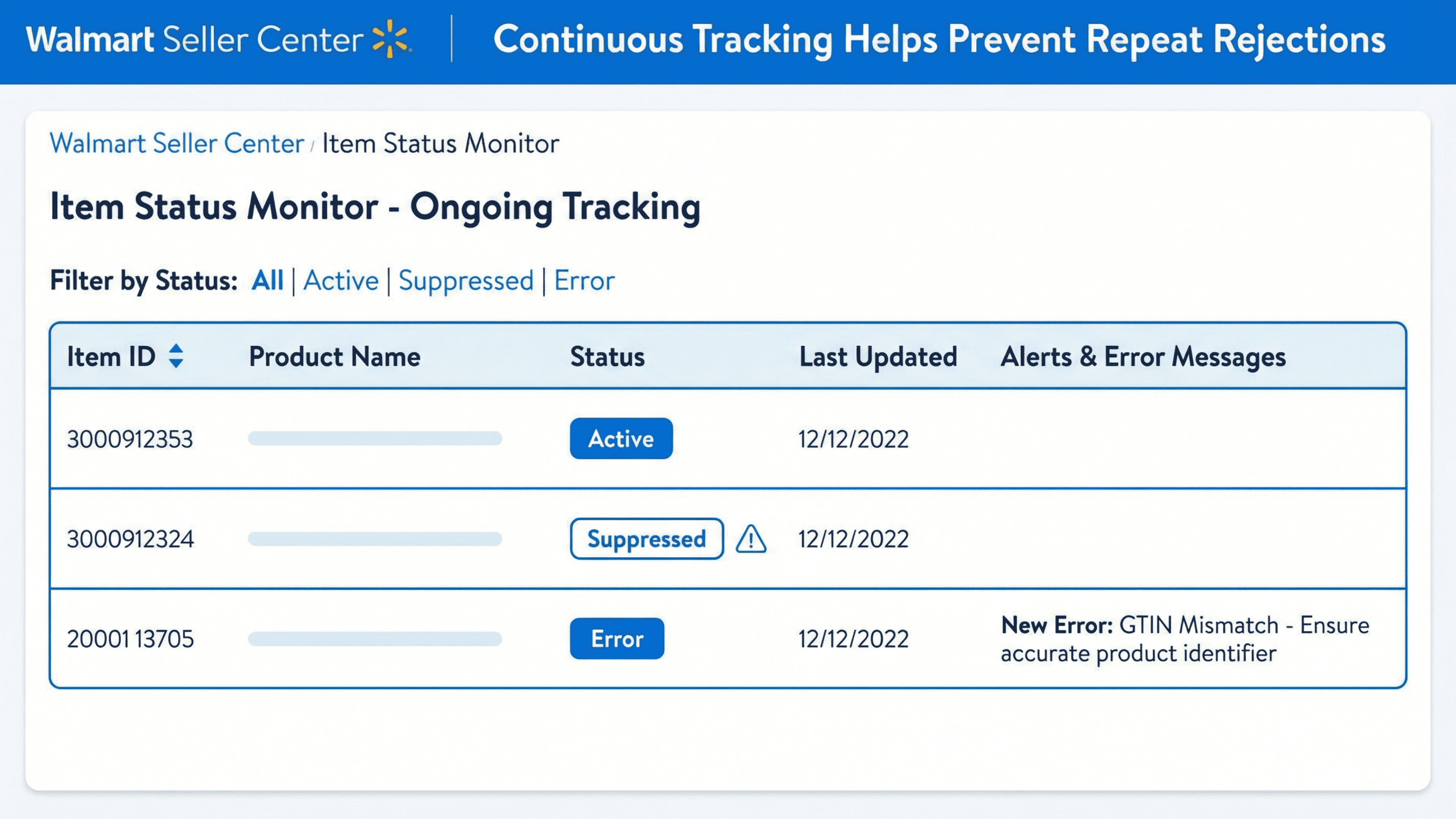 Go to Items → Item Issues / Item Status Walmart displays error messages or codes explaining the issue.