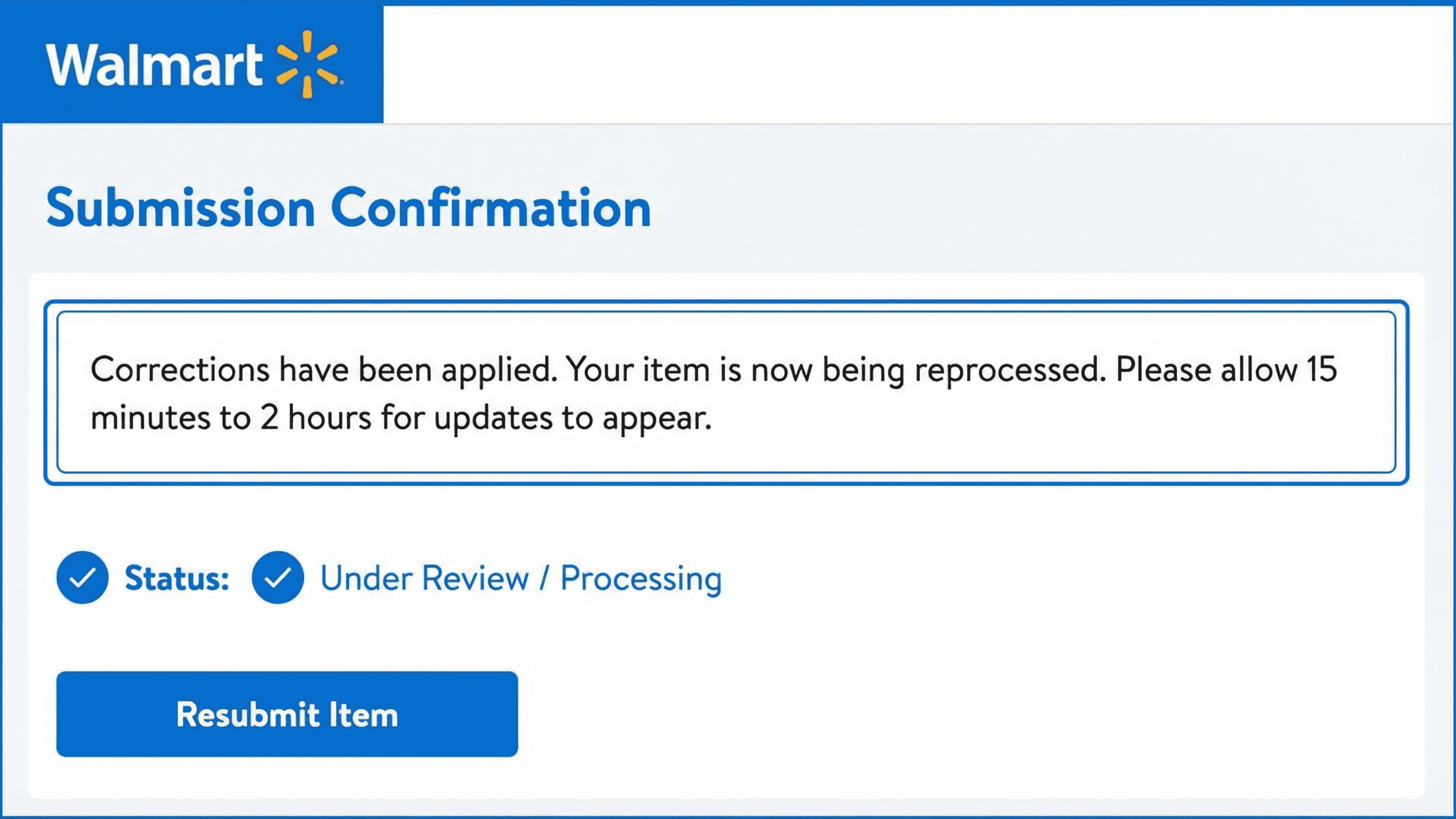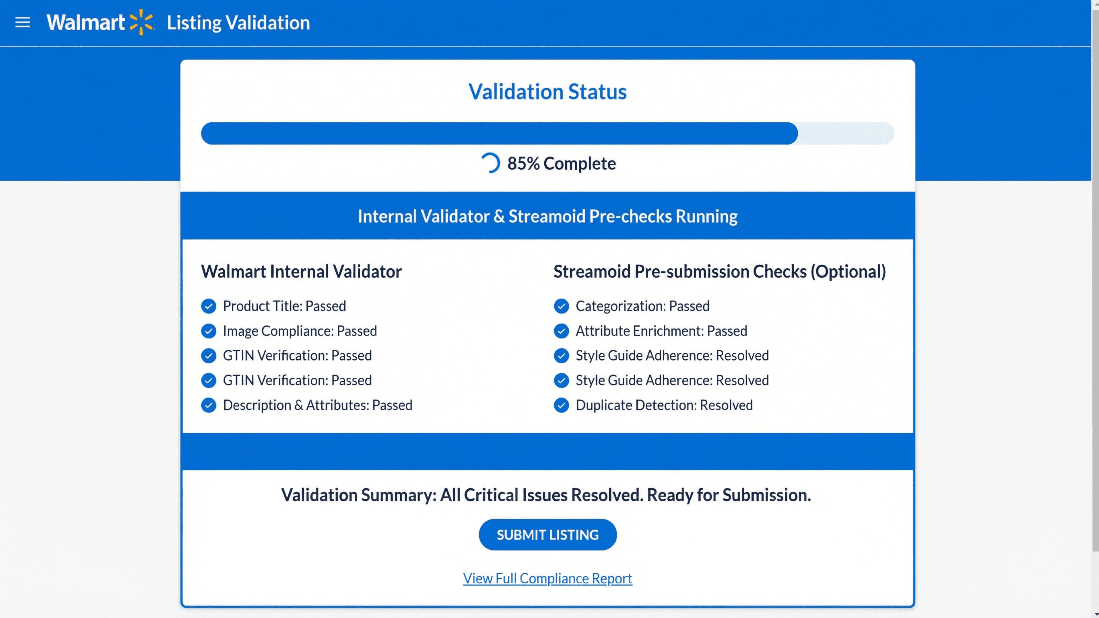 Use Walmart’s validator or Streamoid’s pre-submission checks to ensure all issues are resolved.