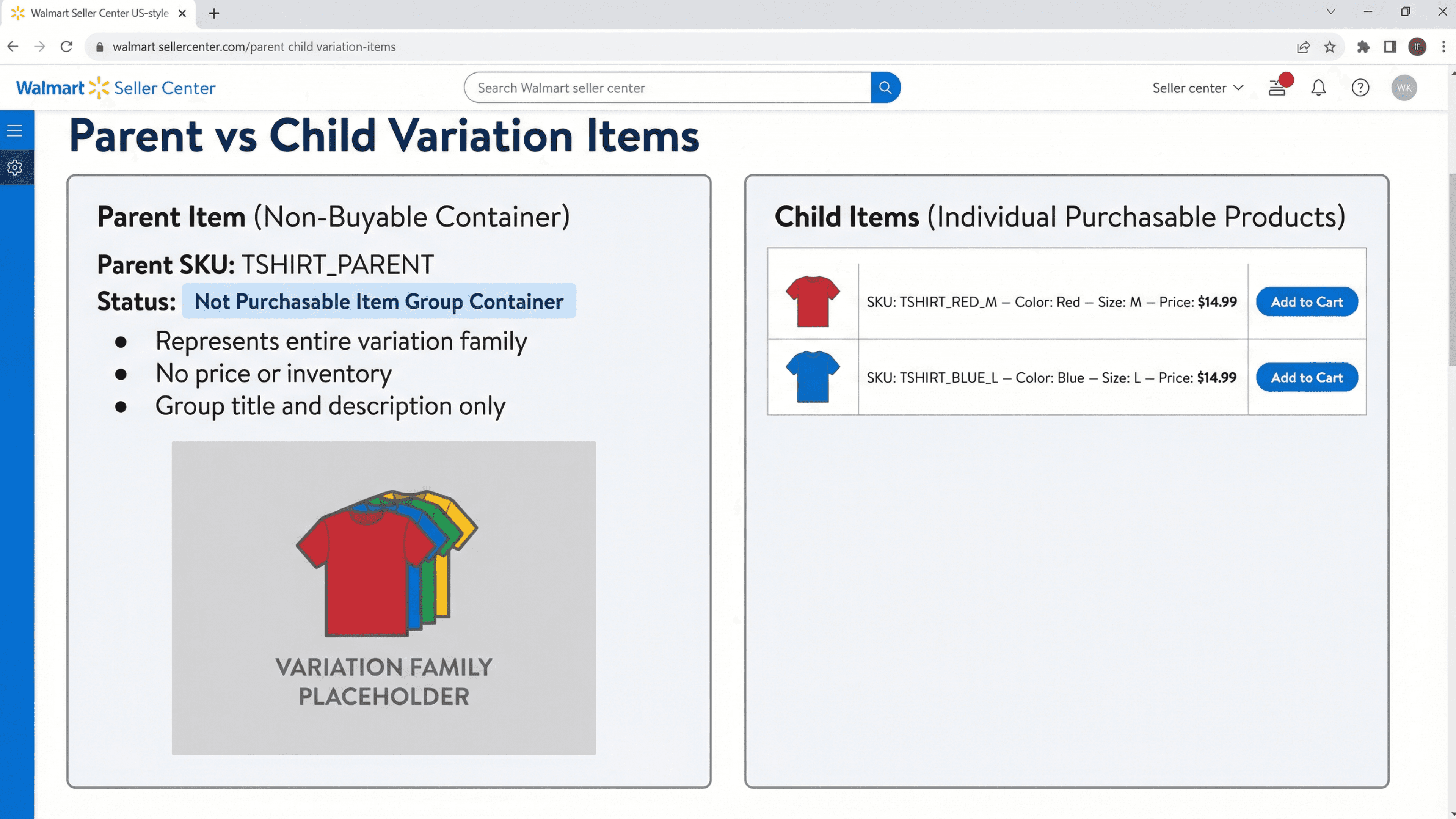 Walmart variations help shoppers view related products such as colors, sizes, or styles within a single parent listing.
