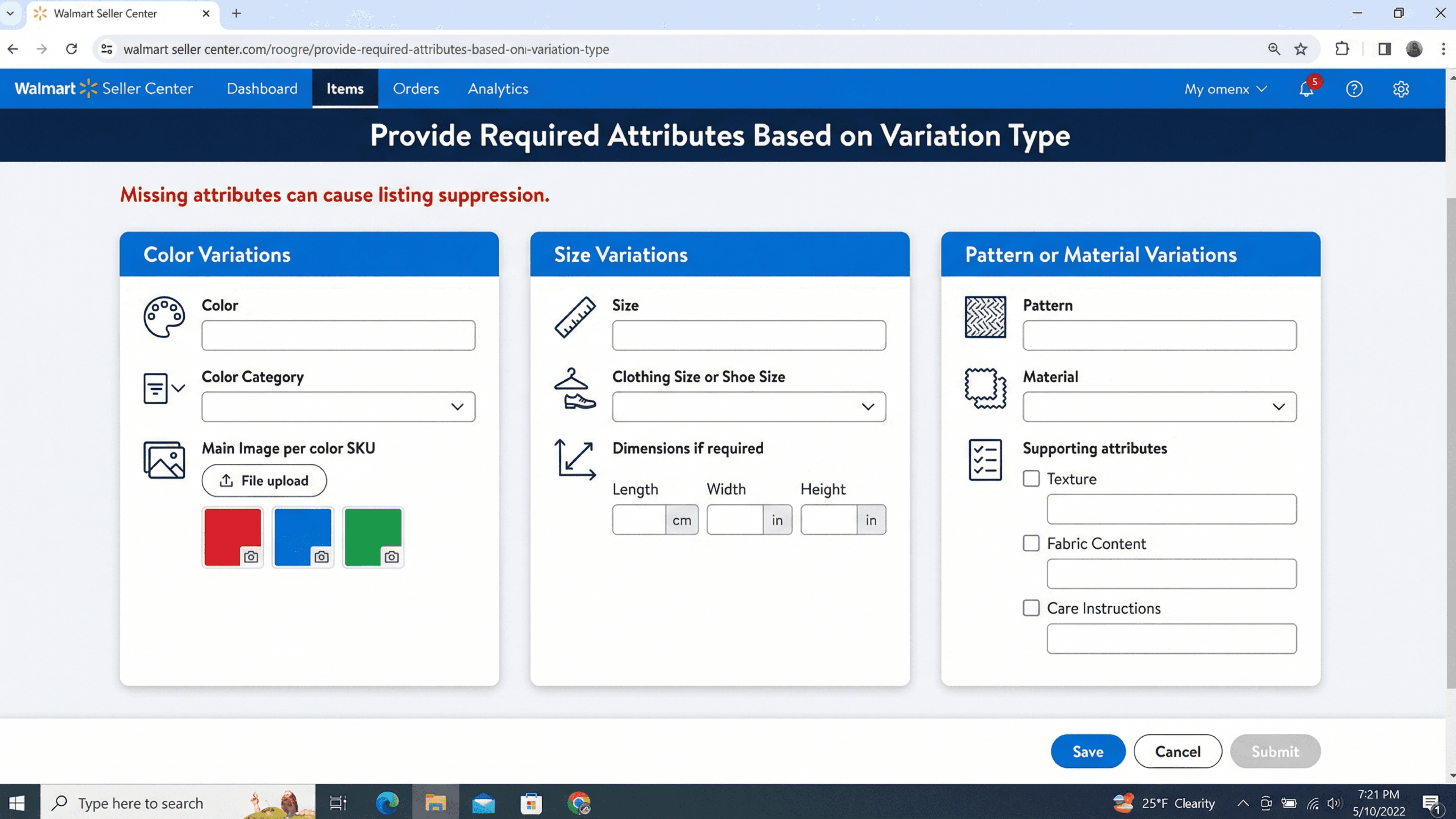 Missing required variation attributes can cause listing suppression.