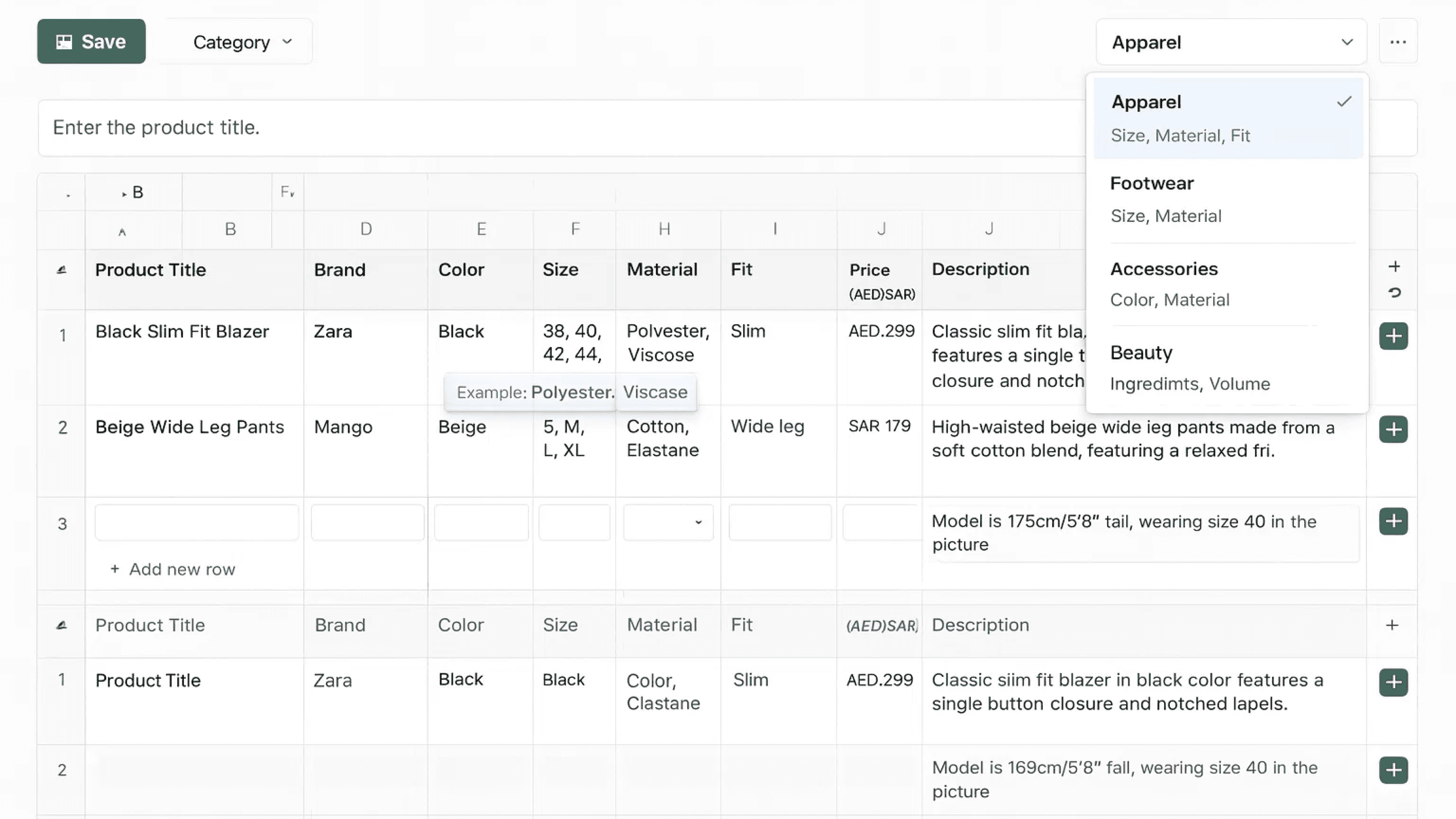 Size chart mapping | Style classification | Material composition | Shelf life |