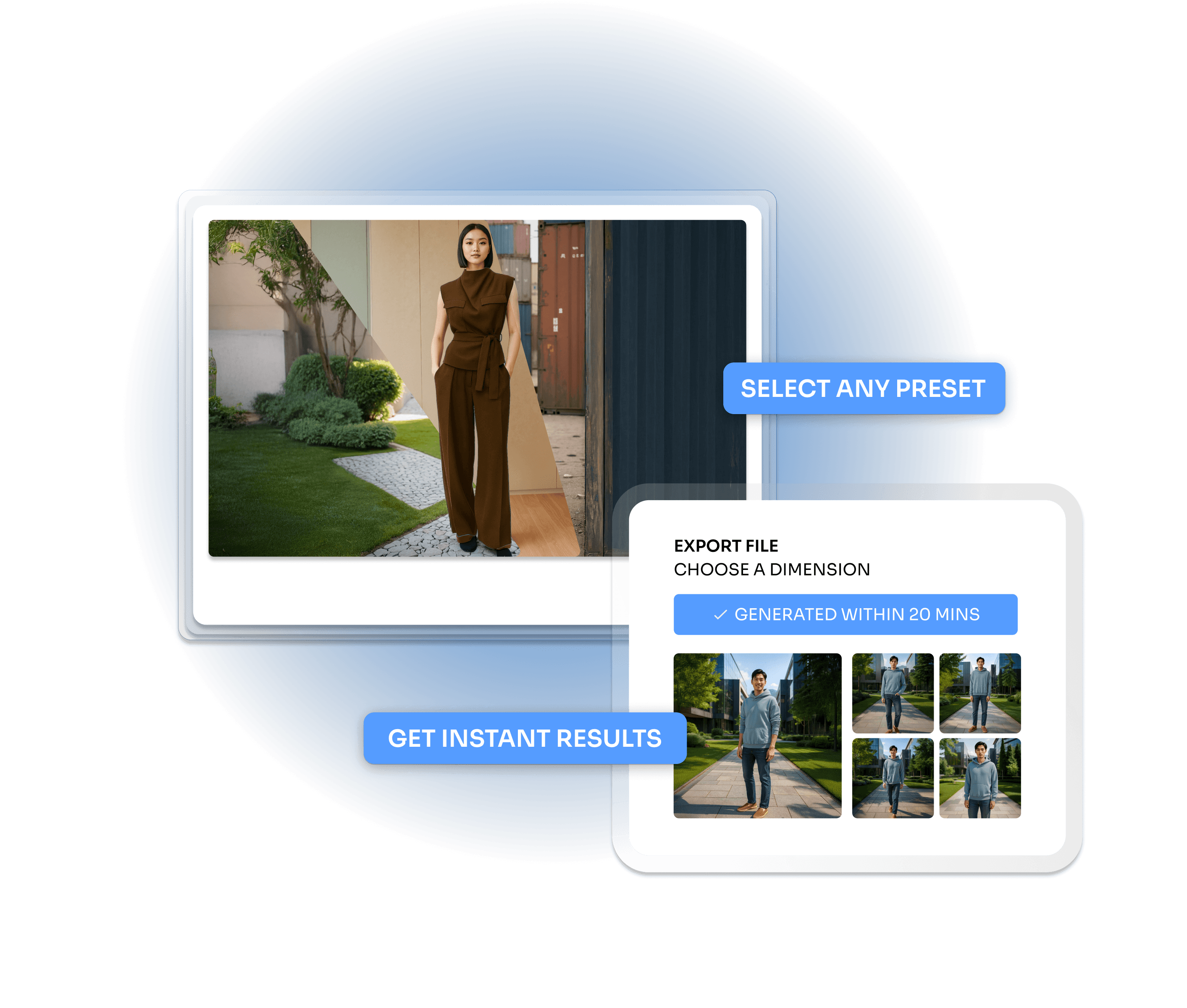 Select studio, lifestyle, thematic presets or describe one with a simple prompt.